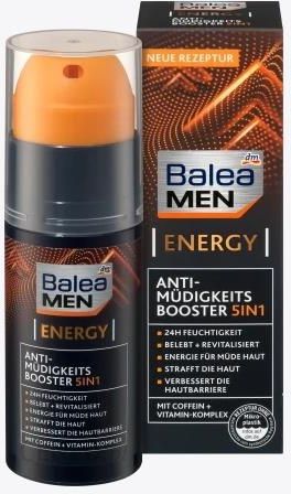 Z Balea MEN Energy Anti-Fatigue Booster 5w1 codziennie dostarczasz zmęczonej i zestresowanej skórze nowej energii i świeżości. Zapewnia nawilżenie przez 24 godziny, napina skórę i zauważalnie ją rewitalizuje.Formuła bez mikroplastików i rozpuszczalnych w wodzie, czysto syntetycznych polimerów