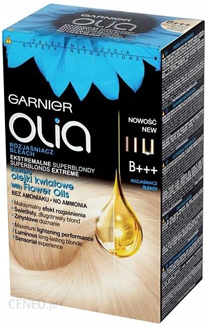 Chcesz rozjaśnić włosy, ale boisz się, że potem będą wyjątkowo zniszczone? Nie chcesz się farbować, bo w składzie zawsze jest amoniak, a Ty go unikasz? A może masz wrażliwą skórę głowy i zraziłaś się do wielu farb?Garnier Olia B+++ to przełomowe rozwiązanie, ponieważ w przeciwieństwie do większości rozjaśniaczy i farb dostępnych na rynku nie zawiera amoniaku. Wyjątkowa formuła kremu koloryzującego Garnier Olia zawiera aż 60% naturalnych olejków kwiatowych i skutecznie zabezpiecza powierzchnię włosa przed uszkodzeniami.Nie tylko sam włos jest pod ochroną. Skóra głowy również, dlatego rozjaśniacz Olia B+++ może dobrze sprawdzić się nawet gdy skalp jest wrażliwy i potrzebuje specjalnej opieki (aby mieć całkowitą pewność wykonaj test na małym skrawku skóry).Koloryzacja jest trwała i równocześnie widocznie poprawia jakość włosów, pielęgnując je podczas zabiegu. Kolor wnika w głąb, dzięki czemu jest intensywny i maksymalnie nasycony, a włosy przy tym nie wyglądają na przesuszone. Wręcz przeciwnie – są pełne blasku i jedwabiście miękkie.Unikalna formuła rozjaśniająca składa się z trzech elementów:- kremu utleniającego, który dodatkowo zawiera do 25% oleju kwiatowego. Dzięki takiemu połączeniu powierzchnia włosa jest dobrze zabezpieczona,- pudru rozjaśniającego, który jest najważniejszym składnikiem, bo to właśnie on odpowiada za maksymalny efekt rozjaśnienia,- kremu rozjaśniającego, który w przeciwieństwie do większości podobnych produktów nie ma charakterystycznego dla amoniaku zapachu (jest bezzapachowy, a cała kompozycja pachnie delikatnie i kwiatowo).Dzięki takim składnikom produkt zapewnia maksymalny efekt rozjaśnienia. Pamiętaj jednak, że ostateczny kolor zależy od koloru wyjściowego.Aplikacja rozjaśniacza jest przyjemna nie tylko ze względu na brak duszącego zapachu amoniaku. Oprócz tego, Garnier Olia ma kremową konsystencję, która nie spływa z włosów znacznie zwiększając komfort i łatwość zabiegu. Cały proces koloryzacji powinno zakończyć się dołączoną do zestawu odżywką, która zawiera ekstrakt z pestek słonecznika i kamelii, sprawiając, że włosy pozostają niezwykle miękkie i gładkie.Sposób użycia:1. Wymieszaj ze sobą krem utleniający, proszek i krem rozjaśniający. Na ramiona nałóż ręcznik i załóż rękawiczki.2. Suche, nieumyte włosy rozdziel na dwie sekcje.3. Aplikację farby zacznij od nasady. Aby ułatwić sobie zadanie, każdą z sekcji porozdzielaj na mniejsze pasemka. Nie zapomnij o włosach przy czole i z tyłu głowy.4. Pozostałą część farby nałóż na resztę długości włosów.5. Przeczesz palcami parę razy całe włosy, aby dokładnie pokryć wszystkie pasma farbą. Poczekaj 30 minut.6. Nie zdejmując rękawiczek, zrób masaż skóry głowy, aby rozdzielić zlepione farbą włosy. Po chwili lekko zmocz je i zrób masaż jeszcze raz.7. Dokładnie spłucz włosy letnią wodą, do momentu aż woda będzie czysta.8. Nałóż odżywkę „Jedwabista miękkość i blask”, poczekaj 3 minuty i spłucz ją.Opakowanie zawiera:- butelkę kremu utleniającego- saszetkę proszku rozjaśniającego- tubkę kremu rozjaśniającego- odżywkę „Jedwabista miękkość i blask”- rękawiczki- instrukcjęGarnier Olia rozjaśniacz do włosów B+++ to produkt do dekoloryzacji, jednak jeśli szukasz farby koloryzującej zobacz resztę produktów z serii Garnier Olia. Znajdziesz tam zarówno odcienie brązu, czerni, czerwieni, miedzi, jak i blondu.