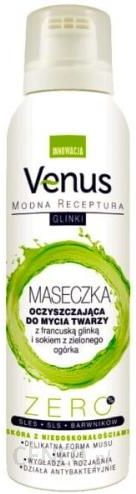 Venus, Modna Receptura Glinki. Maseczka oczyszczająca twarz do skóry z niedoskonałościami, francuska glinka, sok z zielonego ogórka. Innowacyjna maseczka w formie delikatnego musu skutecznie oczyszcza i pielęgnuje skórę. Produkt został stworzony dla każdego rodzaju skóry szczególnie wrażliwej z tendencją do zaskórników, która nie toleruje tradycyjnych preparatów myjących. W skład preparatu wchodzi francuska glinka (zielona) i sok z ogórka. Odpowiednio nawilża i chroni przed nadmiernym przesuszeniem Wygładza i rozjaśnia przebarwienia Posiada doskonałe właściwości oczyszczające Matuje i rozjaśnia Działa antybakteryjnie Delikatna, zmywalna forma 100% naturalne składniki aktywne: Francuska glinka: działa oczyszczająco, zmniejsza wydzielanie sebum oraz poprawia elastyczność skóry. Sok z ogórka: nawilża, koi, zmniejsza widoczność porów, odświeża skórę. 0%: SLES, SLS, barwników. Produkt przebadany dermatologicznie.