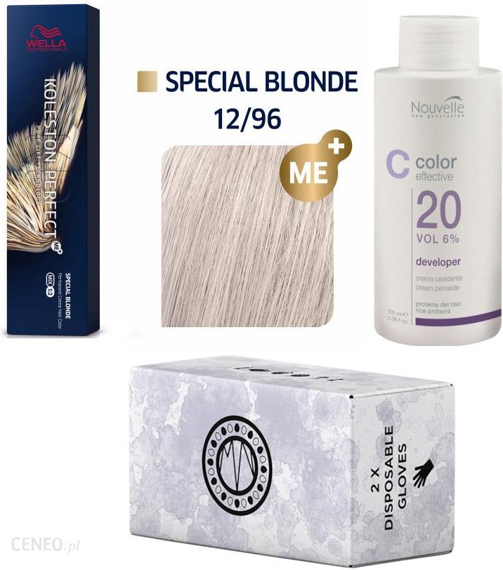 Zestaw do samodzielnego farbowania włosów. W skład zestawu wchodzą:- trwała farba do włosów Wella Koleston Perfect ME+ 60ml Special Blonde 12/96- utleniacz do farby Nouvelle 6% Developer 100ml- 2 pary jednorazowych rękawiczek Maria Nila Disposable GlovesMarzysz o głębokim, mocno nasyconym kolorze? Pragniesz przyjemnej i łatwej koloryzacji w domowym zaciszu? Wella Koleston Perfect jest właśnie dla Ciebie! Produkt gwarantuje 100% pokrycia siwych włosów. Kolor można zmienić nawet o trzy tony, a dzięki temu, że farba zawiera składniki pielęgnujące nie narażasz swoich włosów na uszkodzenia. Formuła farby jest oparta na bazie innowacyjnej molekuły ME+ z pigmentem, która sprawia, że produkt nie powoduje alergii i reakcji uczuleniowych. Delikatny, kwiatowy zapach nie podrażnia nosa i z pewnością jest ogromnym atutem. Praktyczne, niewielkie opakowanie utleniacza Nouvelle (100ml) doskonale sprawdzi się w domowym użyciu. Kremowy, wysoce wydajny i stabilny utleniacz przeznaczony jest do łączenia z farbami, rozjaśniaczem lub kremami do dekoloryzacji. Produkt zawiera nadtlenek wodoru.Maria Nila Disposable Gloves to zestaw 2 par rękawiczek jednorazowych. Rękawiczki są trwałe i mocne, wytrzymają długą pracę podczas koloryzacji. Rękawiczki doskonale sprawdzą się podczas koloryzacji włosów czy stosowania masek i odżywek z pigmentami barwiącymi. Doskonałe uzupełnienie kosmetycznych rytuałów, gdzie liczy się nie tylko efekt końcowy, lecz także czystość i schludność dłoni i stanowiska pracy.